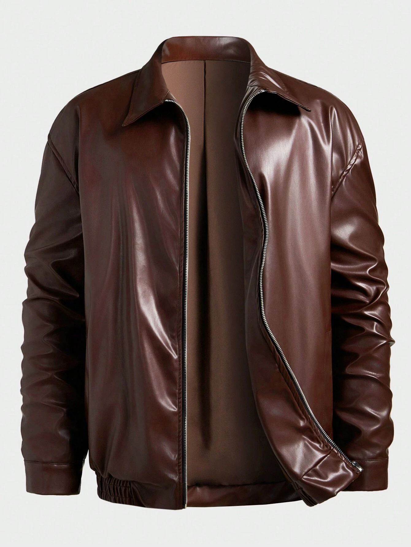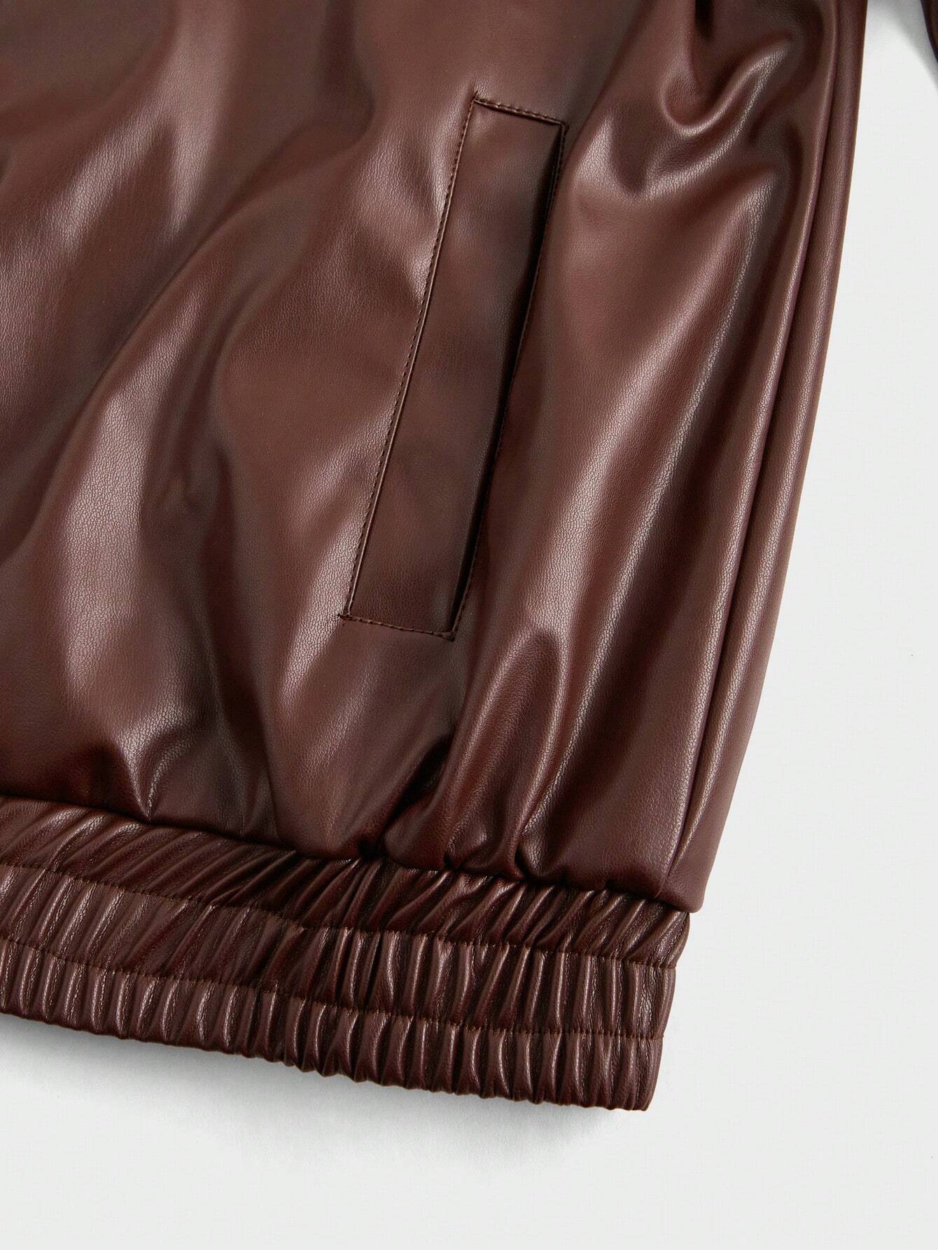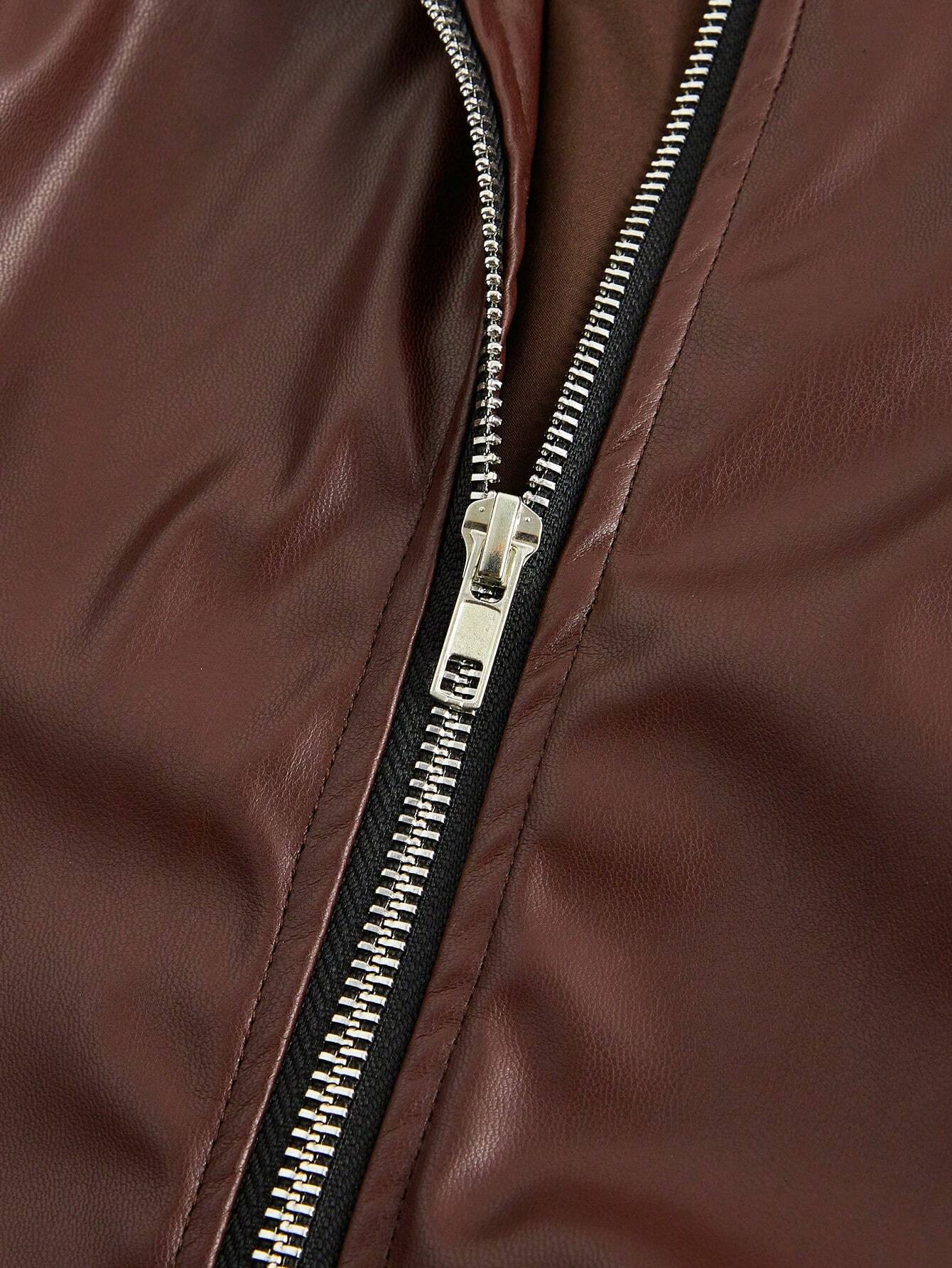 Manfinity Homme Men’s Solid Color Collar PU Leather Zipper Casual Long Sleeve Jacket